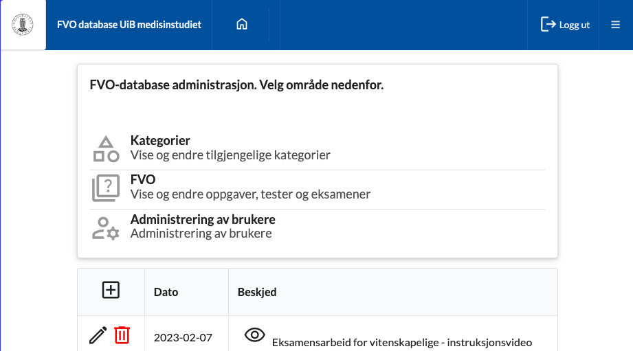 På forsiden ser man hvilke hovedområder FVO databasen er inndelt i. Bildet under viser et eksempel fra UiB der man kan velge mellom kategorier, FVO og administrering av brukere. Administrering av brukere vil bare vises dersom man har spesielle rettigheter.